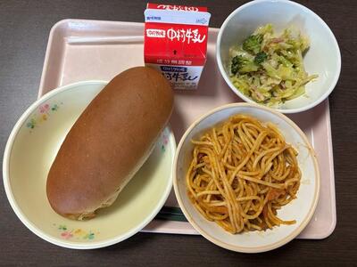 今日のメニュー【ミニ黒糖パン、牛乳、スパゲティナポリタン、花野菜サラダ】