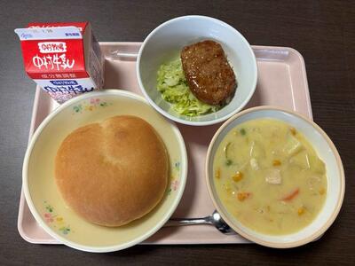 今日のメニュー【バーガーパン、牛乳、コーンポタージュ、照り焼きパティ、茹でキャベツ】
