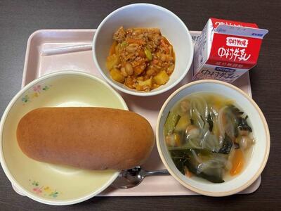 今日のメニュー【ミルクパン、牛乳、ラビオリスープ、じゃがいもと豆のミートソース】