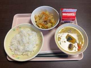 今日のメニュー【ごはん、牛乳、カボチャの団子汁、じゃいものそぼろ煮】