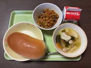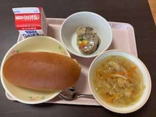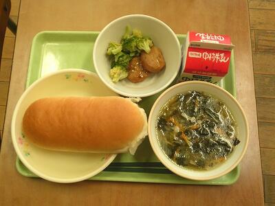 ☆ミルクパン ☆牛乳 ☆ほうれんそうのスープ ☆平つくね2個 ☆ゆでブロッコリー
