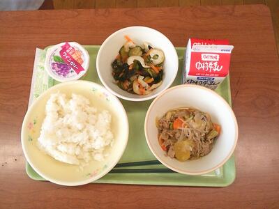 ☆ごはん ☆牛乳 ☆さつまいもの煮物 ☆きゅうりとわかめの酢の物 ☆ワインゼリー