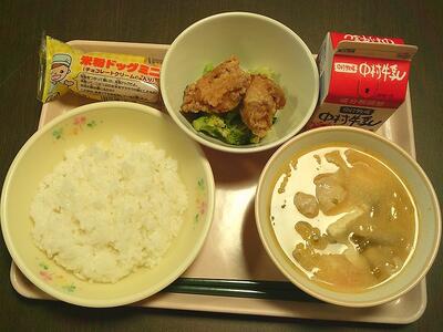 ☆減量ごはん ☆牛乳 ☆キムチ汁 ☆唐揚げ ☆ゆでブロッコリー ☆チョコワッフル