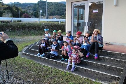 今週から寒くなってきました。子どもたちは業間の時間に持久走の練習をがんばっています。練習後に分校のイチョウの木をバックに記念撮影しました。