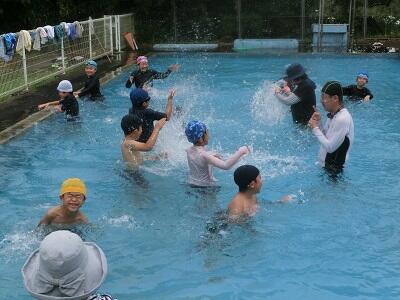 昨年度は、新型コロナウイルス感染症のために、水泳の学習ができませんでしたが、今年は行うことになりました。プールの約束などを聞いた後、水慣れから始まり、最後は水かけをしました。子ども達は楽しそうに活動していました。