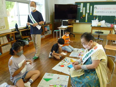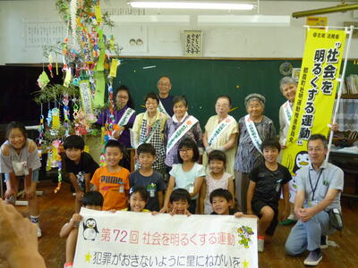 都農町の社会を明るくする運動に参加されている方々に手伝ってもらいながら、七夕飾りを作りました。どうぞみんなの願いがかないますように。