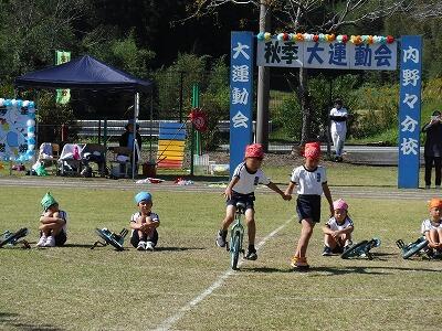 内野々分校の児童はみんな一輪車に乗ることができるようになります。1年生も1学期からたくさん練習しています。