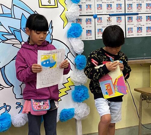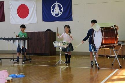 1・2年生が元気よく、音読、合奏の発表をしました。