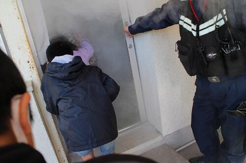 3学期は、火災を想定して避難訓練を行いました。そして教室の中でスモーク体験も行いました。