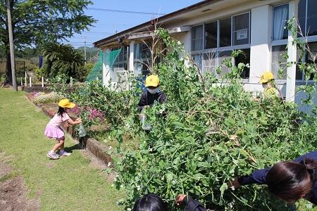下校前、子どもたちは、大人気のスナックエンドウをたくさん収穫しました。