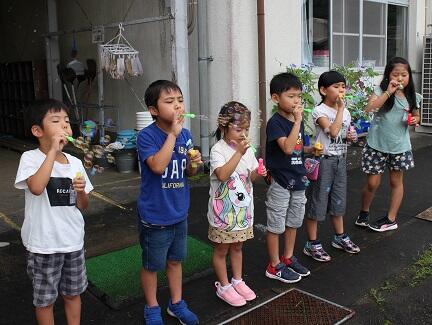 1・2年生が生活科の学習でシャボン玉遊びをしました。