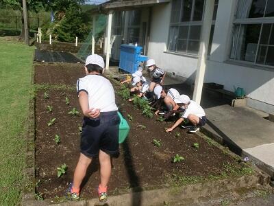 朝の時間に学級園の手入れをしました。これから花が大きく育つのが楽しみです。