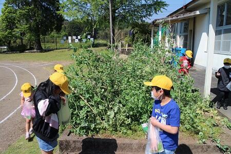 下校前、子どもたちは、大人気のスナックエンドウをたくさん収穫しました。