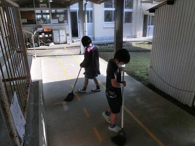 朝の時間に、全員で朝のボランティア清掃をしています。一人一役で学校をきれいにしています。