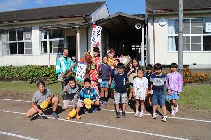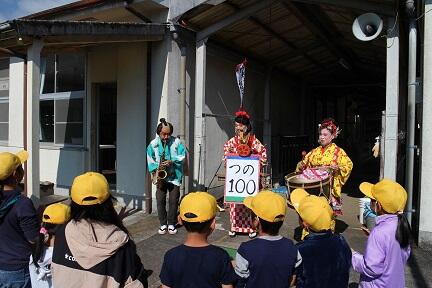 都農町出身で南九州唯一のちんどん屋、「花ふぶき一座」のみなさんが内野々分校へやってきました。生の演奏を目の前で聴くことができて、子どもたちも大満足でした。
