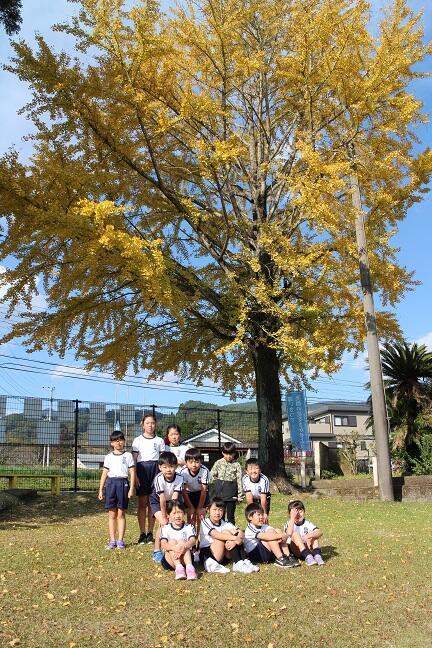 今週から寒くなってきました。子どもたちは業間の時間に持久走の練習をがんばっています。練習後に分校のイチョウの木をバックに記念撮影しました。