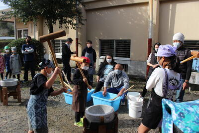 おうちの人に手伝ってもらって、みんなでおもちをついて丸めました。
