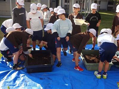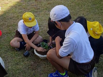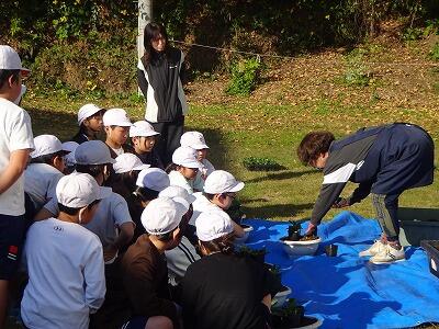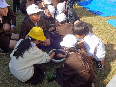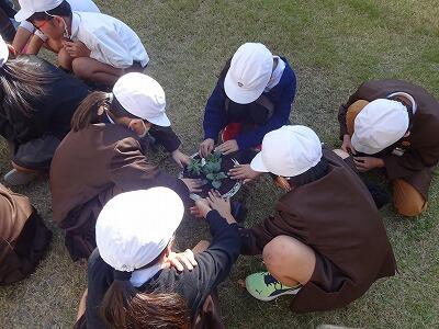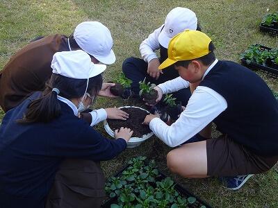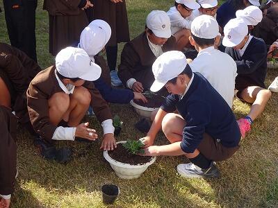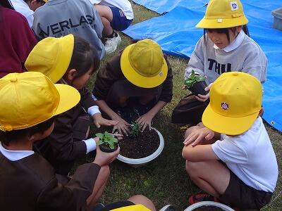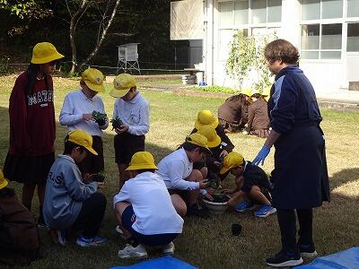 来年春の卒業式等に向けて、各学年で春に咲く花の苗をプランターに植えています。昨日そして本日11月27日(木)は4・5年生が学校技術員さん方の指導のもと、グループで協力して丁寧に花の苗を植えていました。これからの水やり等の世話もがんばってほしいと思います。