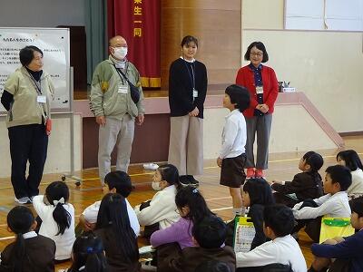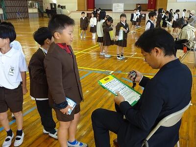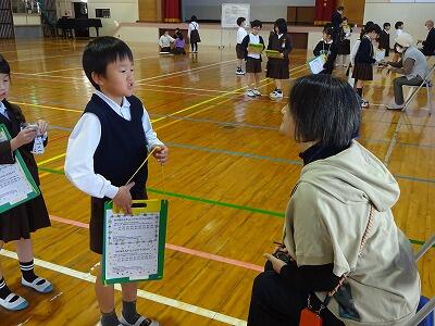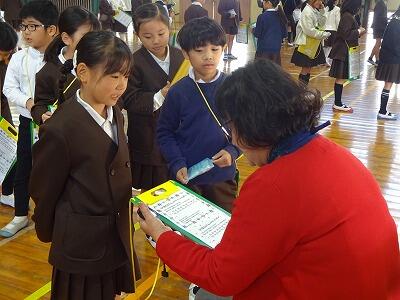 11月28日(金)2校時、2年生は体育館で「かけ算九九チャレンジ大会」を行いました。審査員として学校運営協議会委員、地域の民生委員児童委員の方々をお招きして、子どもたちがチャレンジカードを手に審査員の前でこれまでの練習の成果を発表しました。合格するとカードにサインをもらうことができます。九九暗唱中の真剣な表情が、おほめの言葉をいただいてにっこり笑顔に変わる様子が印象的でした。ご協力いただいた皆様、ありがとうございました。