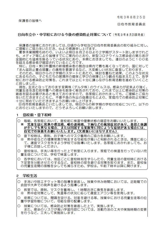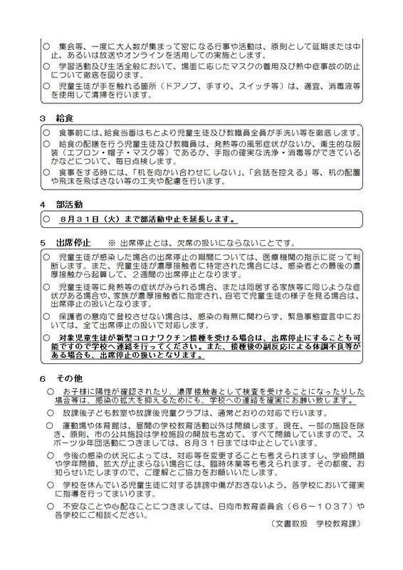 なお、下校後や休日の児童の過ごし方としましては、今まで同様、外出するときにはマスク着用、密になって遊ばないなど、感染予防をお願いします。