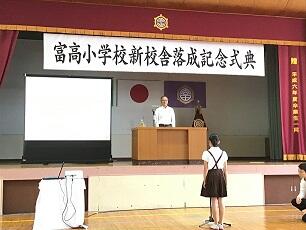 はじめに、来賓の方々と6年生でテープカットを行いました。テープカットの後は体育館で式典を行いました。式典では日向市の十屋幸平市長に富高小学校時代の思い出や、日向市の町並みの変遷について話していただきました。また、児童発表として、富高小てんてこてんによるひょっとこ踊りや5年生による「西郷どんのテーマ」の合奏、4~6年生による「COSMOS」の合唱を披露しました。