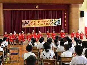 歓迎会では全児童が体育館に集まり、モミラニ小の皆さんを出迎えました。モミラニ小の児童は、元気よく日本語であいさつと自己紹介をしてくれました。またとても素敵な歌とフラダンスを披露してくれました。そのお返しに、富高小児童のてんてこてんチームがひょっとこ踊りを披露しました。また、記念にひょっとこのお面をプレゼントしました。