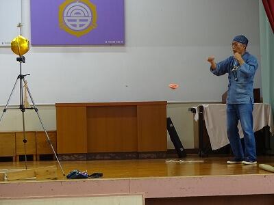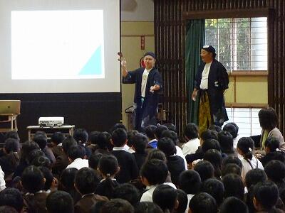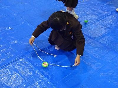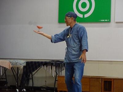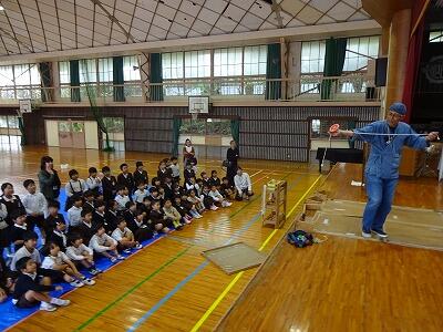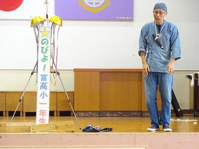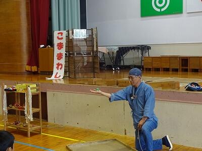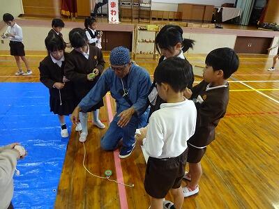 11月4日(火)3校時、1年生は体育館で生活科「こま回し体験」に挑戦しました。今年も”こま回し名人”の「ミゾさん」をお迎えして、まずはステージで数々の”名人技”をご披露いただきました。スゴ技の連続に子どもたちからは歓声が上がっていました。せっかくの機会でしたので、保護者や地域の方にも見ていただきました。後半は1年生の子どもたちがこま回しに挑戦。ミゾさんや保護者の方々に教えていただきながらがんばっていました。