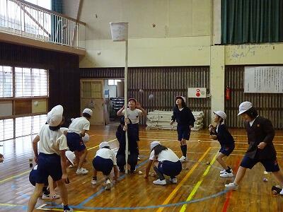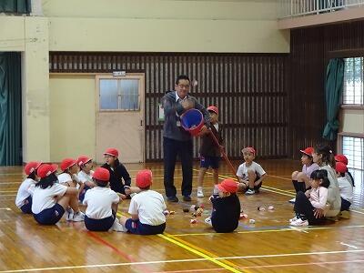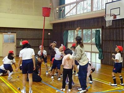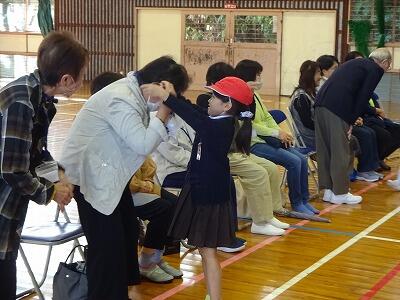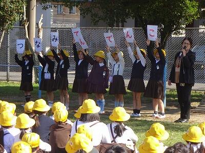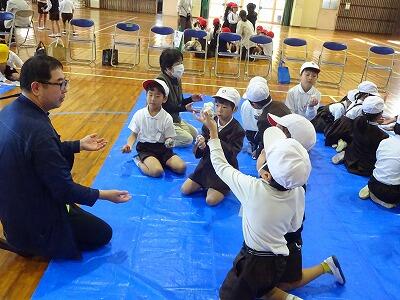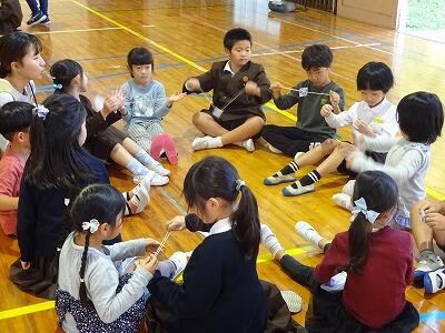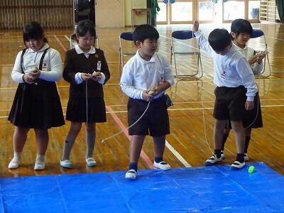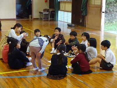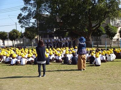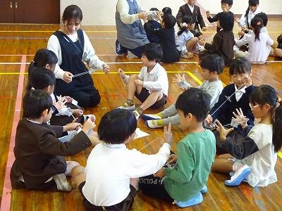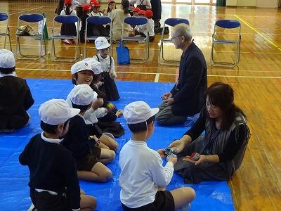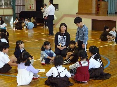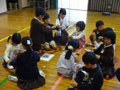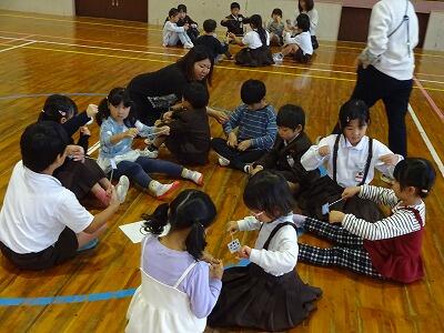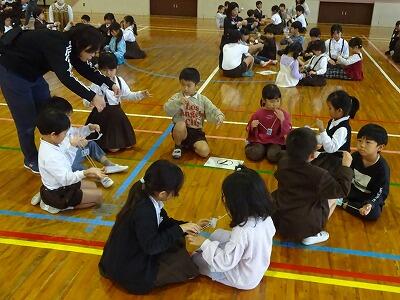 11月14日(金)校区内の4つの幼稚園・保育園の年長さんと先生方をお招きして、1年生が交流会を行いました。2校時は国語、算数の授業の様子を見てもらいました。3校時は体育館で交流会です。はじめに1年生の校歌斉唱を聞いてもらった後、グループに分かれて”ぶんぶんごま”で交流しました。教えたり、おしゃべりしたりしながら楽しく交流する姿が見られました。