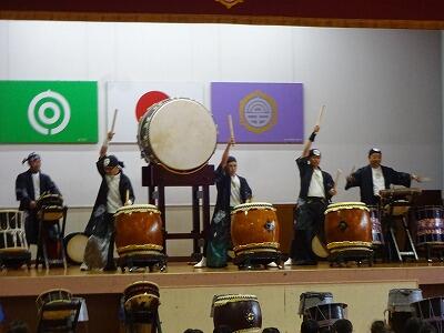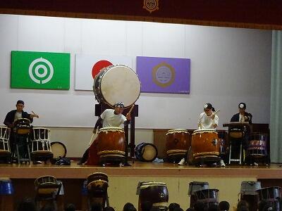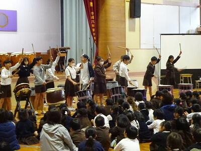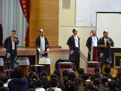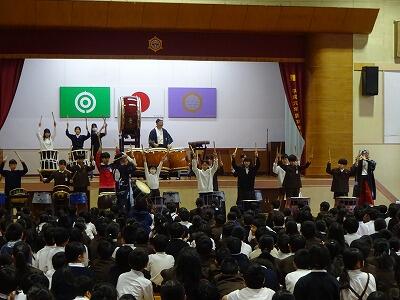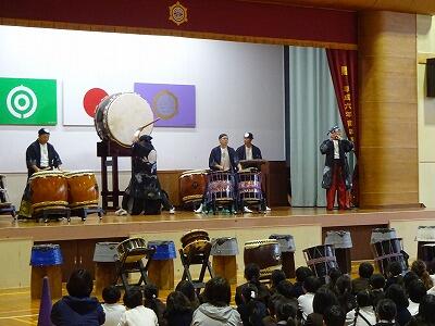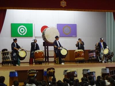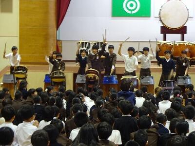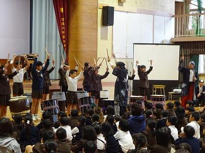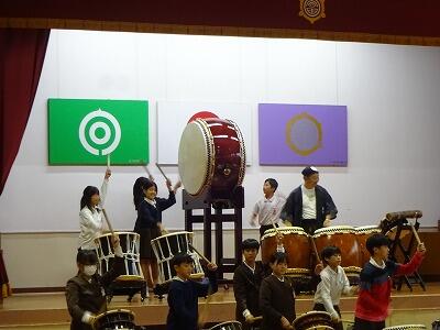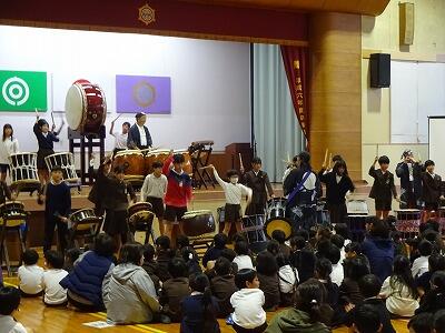 11月12日(水)3・4校時、全校児童が体育館に集まって鑑賞教室を行いました。今回は「日向十五夜太鼓」の皆さんをお招きして、和太鼓の演奏を聞かせていただきました。太鼓の迫力ある音やいろいろなテンポのリズム、そして息の合った演奏に子どもたちは聞き入っていました。途中に「和太鼓クイズ」の企画もあり、子どもたちは大喜び、大盛り上がりでした。最後に6年生が体験練習をして、一部の子どもたちはラストの「祭」という曲の演奏に参加しました。「日向十五夜太鼓」皆さん、すばらしい時間をありがとうございました。