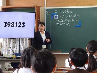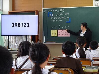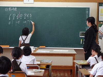 6月12日(木)2校時は、3年生算数「1万をこえる数」の研究授業が行われました。日向市、宮崎市、宮崎県の人口など1万をこえる数の読み方、書き方、数の構成について、子どもたちは位取り表をうまく使いながら考えていました。担任もICTを活用しながら、今日の授業に臨んでいました。