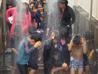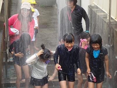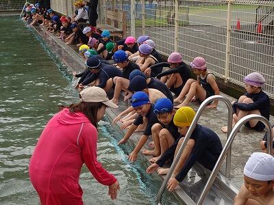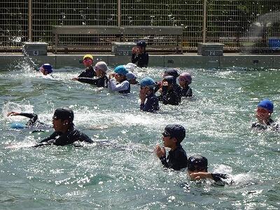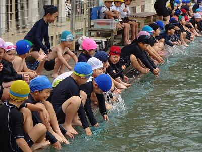 6月17日(火)2・3校時、いよいよ1年生のプールびらきの日がやってきました。きっと待ちわびていたことと思います。プールでの約束を守り、先生の指示にしたがって、きまりよく水遊びを楽しんでいました。最初のうちは"おっかなびっくり"の様子も見られましたが、だんだんと慣れて、顔を水につけながら活動することができました。