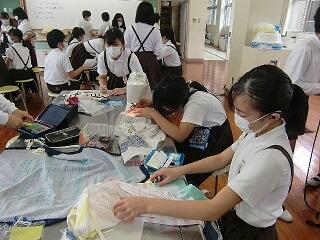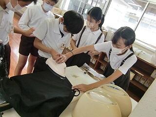 6年生、エプロンをミシンやアイロンを使って上手に仕上げています。