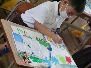 1年生、初めて絵に絵の具を使って色づけしていました。