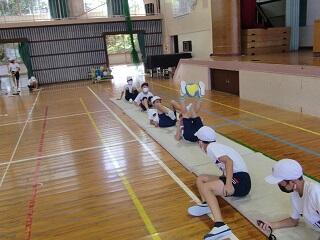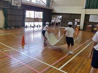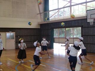 5年生では、コロナ禍の中、密にならないようにして、いっぱい体を動かしたり競い合ったりできるために、いろいろな道具を使って体つくりの運動をしています。ボールを床に思い切り突いて、自分の後ろの人のボールを手でキャッチする運動、マットを2人で運んで折り返す体の動きを高める運動、寝転がって足でボールを次の人に受け渡す巧みな動きを高める運動など行いました。みんなとても真剣に、そして楽しそうに運動していました。