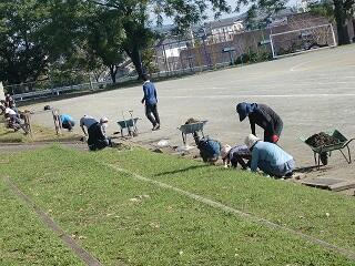 少しずつ秋の気配が感じられる今日この頃、新型コロナウイルス感染症対策を十分に取りながら、10月3日(日)にたくさんのPTAの方々が学校に来てくださり、奉仕作業を行ってくださいました。運動場の砂や土が流れ出た側溝の土砂すくい、機械では刈れない場所の草取りなど、熱心に行っていただきました。お陰で見違えるほどきれいな学校になりました。本当にありがとうございました。