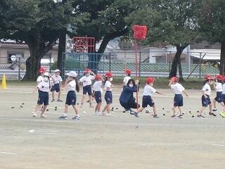 《1年生》 玉入れをしながら、音楽が鳴るとひょっとこを踊ったよ。