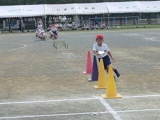 《6年生》 足でボールをコントロール、砂袋跳び、ラケットバランス、縄跳びもしながら競走したよ。