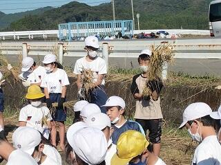 10月26日(火)、5年生は、総合的な学習の時間の『稲作に挑戦しよう』で稲刈りに挑戦しました。6月に田植えをした田んぼで、黄金色に実った稲を鎌で刈りました。収穫したこのお米や餅ごめは、・・・・・今後また掲載していきますのでお楽しみに!!