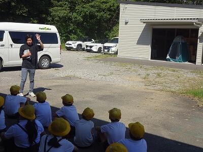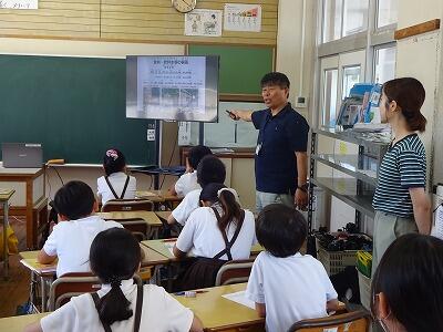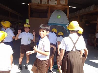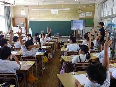 9月30日(火)2・3校時、4年生は社会「自然災害とわたしたちのくらし」で、日向市防災推進課からお二人の方をお招きして、地震津波の際の避難の仕方についてお話を聞きました。避難の際の注意点や避難のために準備しておく物等を、わかりやすく教えていただきました。授業の後半では、本校プール横に設置されている防災倉庫の中を見せていただきました。テント式のトイレやたくさんの食料、飲料水等の備蓄品に子どもたちは驚きの表情でした。(写真は4年2組の授業の様子です。)