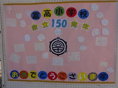 ちなみに下の写真は、市P研究大会の中であくがれ広場に設置されていた「富高小創立150周年」に対するメッセージボードです。週明けからは学校の給食カウンター・多目的ホール前の通路に掲示してあります。