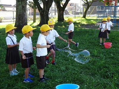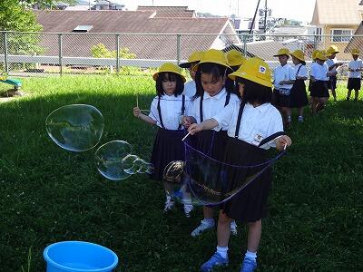 7月8日(月)1年生が生活科で大きなシャボン玉づくりに挑戦しました。2校時は1年1組、朝から強い日射しが照りつけていたので、運動場の木陰で活動しました。シャボン液をうまくつけて、広げて、そして風を送るというのがなかなか難しそうでしたが、上手に大きなシャボン玉を作ることもできました。