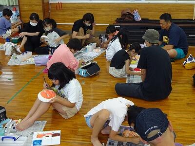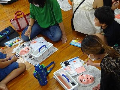 7月13日(土)今日は富小「てんてこてん」「てんてこてんジュニア」チーム、2回目の活動日です。まずは、先々週作ったお面にペーパーをかけて表面をきれいにし、自分たちでの思い思いの色つけを行いました。それぞれ、楽しいお面が完成していました。そのあとは今日も体育館にして、「ひょっとこ踊り」の練習です。ご指導のおかげで、みんなとっても上達していました。