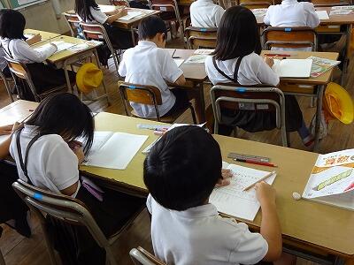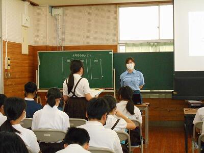9月26日(木)3校時、2年3組では栄養教諭の先生が授業に入って「楽しく食事をするためのマナーをしろう」という学習をしました。食事中の姿勢やはしの持ち方について、大切なことを学びました。はしの持ち方については、実際にはしを使って上手につかむためのポイントを練習しました。給食や家庭での食事の場面でも生かしてくれたらと思います。