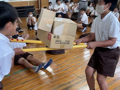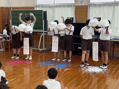 7月18日(木)1学期も残り2日となりました。今日は2校時に10月20日(日)開催予定:秋季大運動会の結団式を行いました。当初の予定では体育館で行うつもりでしたが、暑さ等対策で、多目的ホールと教室をオンラインでつないでの結団式となりました。まずは各団長と副団長が「富っ子宅急便」多目的ホール2周タイムチャレンジをして、速かった団から、団の色を決定するくす玉を選びました。「せーの」でひもを引っ張って「○団」の垂れ幕と紙ふぶきが出てくる予定でしたが、うまく割れず・・・でも、みんな笑顔でした。最後に団長、副団長、リーダーがあいさつをして終了しました。練習本番は2学期に入ってからですが、これからの各団のまとまりが楽しみです。