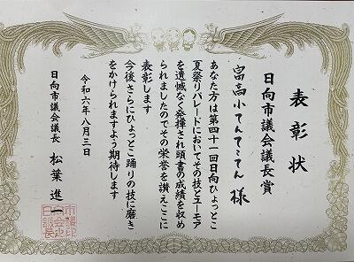 8月3日(土)『第41回日向ひょっとこ夏祭り』が開催されました。本校からは「富高小てんてこてん」「富高小てんてこてんジュニア」の2チームが本祭り踊りパレードに出場(てんてこてんOBも出場してくださいました)、6つのゾーンでこれまでの練習の成果を存分に発揮し、観客の方から大きな声援をいただきました。とても暑い中のパレードで、保護者の皆さんがパレードコースをずっとついて歩いて、子どもたちをサポートしてくださいました。すべて踊り終えた後の子どもたちの表情は本当に満足そうでした。「富高小てんてこてん」チームは審査員特別賞「日向市議会議長賞」をいただきました。これまで支えご指導いただいた地域の皆様、本当にありがとうございました。