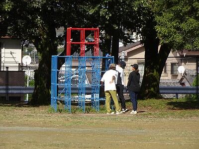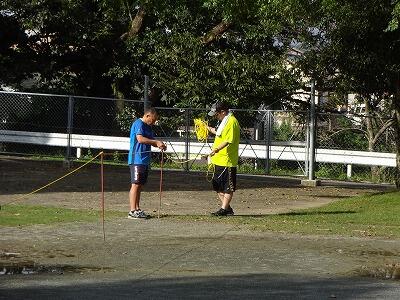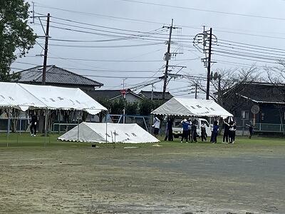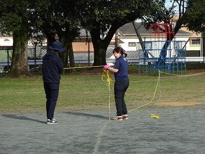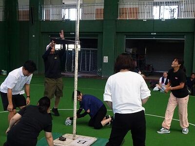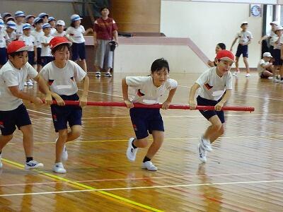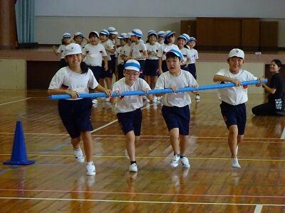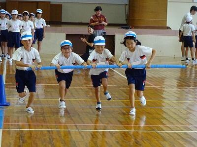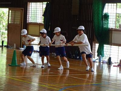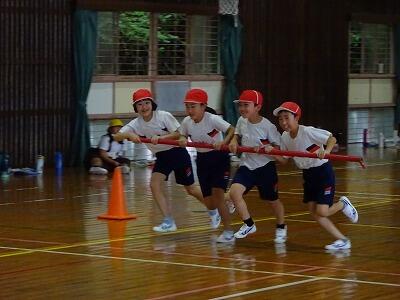 9月20日(金)急に強雨が降り出したかと思えば、止んで日射しが照りつけるということを何度か繰り返す天気。この蒸し暑さの中、3校時に3年生が体育館で運動会団技「台風の目」の練習に取り組んでいました。どうすればうまくコーンを回れるか、どうすればうまく棒を飛び越せるかなど、各クラスでそれぞれ作戦をもとに練習が進められていました。チームワークが試されています。
