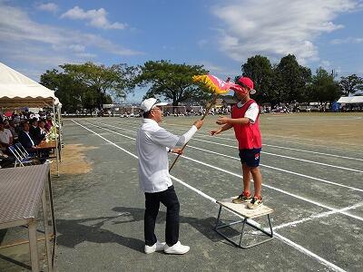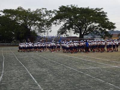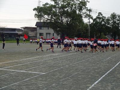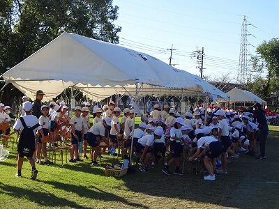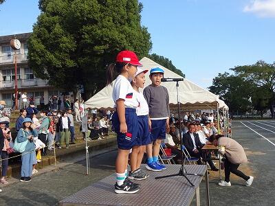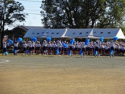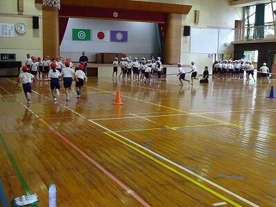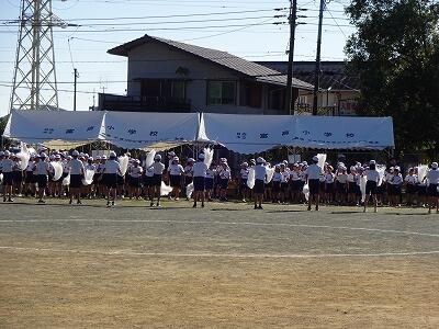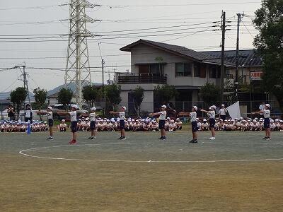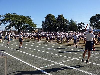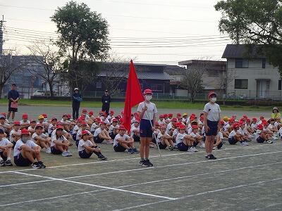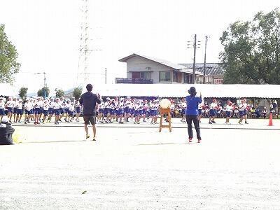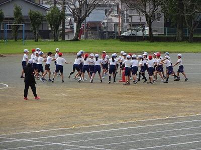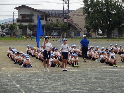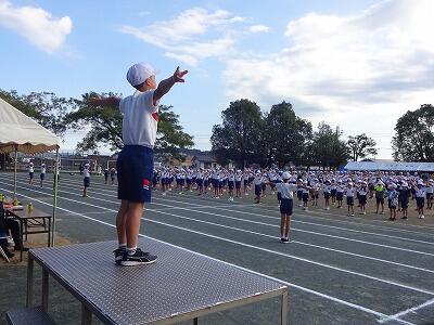 10月2日(水)1校時、先週から延期になっていた全校体育を実施しました。今日も雨が降り出しそうな曇り空でしたが、最後まで降られることなく進めることができました。開会式の整列や礼の仕方、代表児童の動きや退場、エール交換まで子どもたちがしっかりと話を聞いて動いている姿に感心しました。