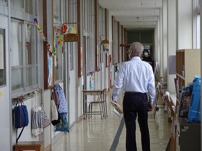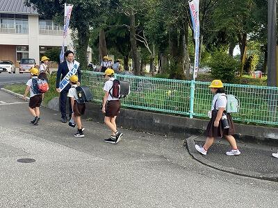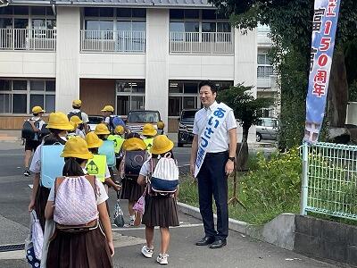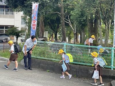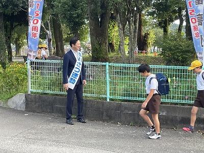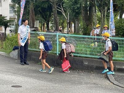 9月24日(火)今朝はずいぶんと涼しくなりました。そんな中、西村市長があいさつ運動に来てくださいました。1学期に引き続き、今回で2回目です。3連休明けの子どもたちに、笑顔で「おはようございます」と声をかけてくださいました。子どもたちもにこやかにあいさつしていました。朝早くからありがとうございました。