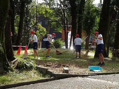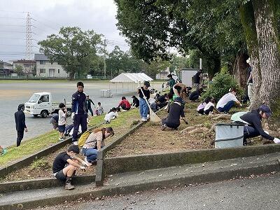 10月6日(日)午前中、PTA奉仕作業を行いました。天候が良くないにもかかわらず、たくさんの保護者の皆さんが参加してくださいました。前日5日(土)の午前中にPTA役員さんを中心に機械を使った草刈り作業を行いました。毎週木曜日夜に多目的ホールで練習をされている『十五夜太鼓』の3名の方が「いつも施設を使わせてもらってるお礼に」と機械を使って草刈り作業を手伝ってくださいました。本当にありがたいことです。6日はその刈った草を集める作業を中心に行いました。途中で雨が降り出し、8時50分に終了となりましたが、皆さんのご協力で学校がとてもきれいになりました。参加してくださった保護者の皆様、ありがとうございました。
