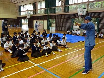 11月5日(火)3校時、1年生は体育館で生活科「むかしのあそびにちょうせん」の授業がありました。今日は鹿児島から「日本こままわし協会段位認定員」でいらっしゃる『こまのミゾさん』(ご出身はこちら)を先生にお招きして教えていただきました。はじめにこまのいろいろなスゴ技をご披露いただきました。1年生から至るところで歓声が上がっていました。そのあと、実際にこまの回し方について丁寧に教えていただきました。難しかったですが、上手に回せた1年生もたくさんいました。とても楽しい時間をありがとうございました。